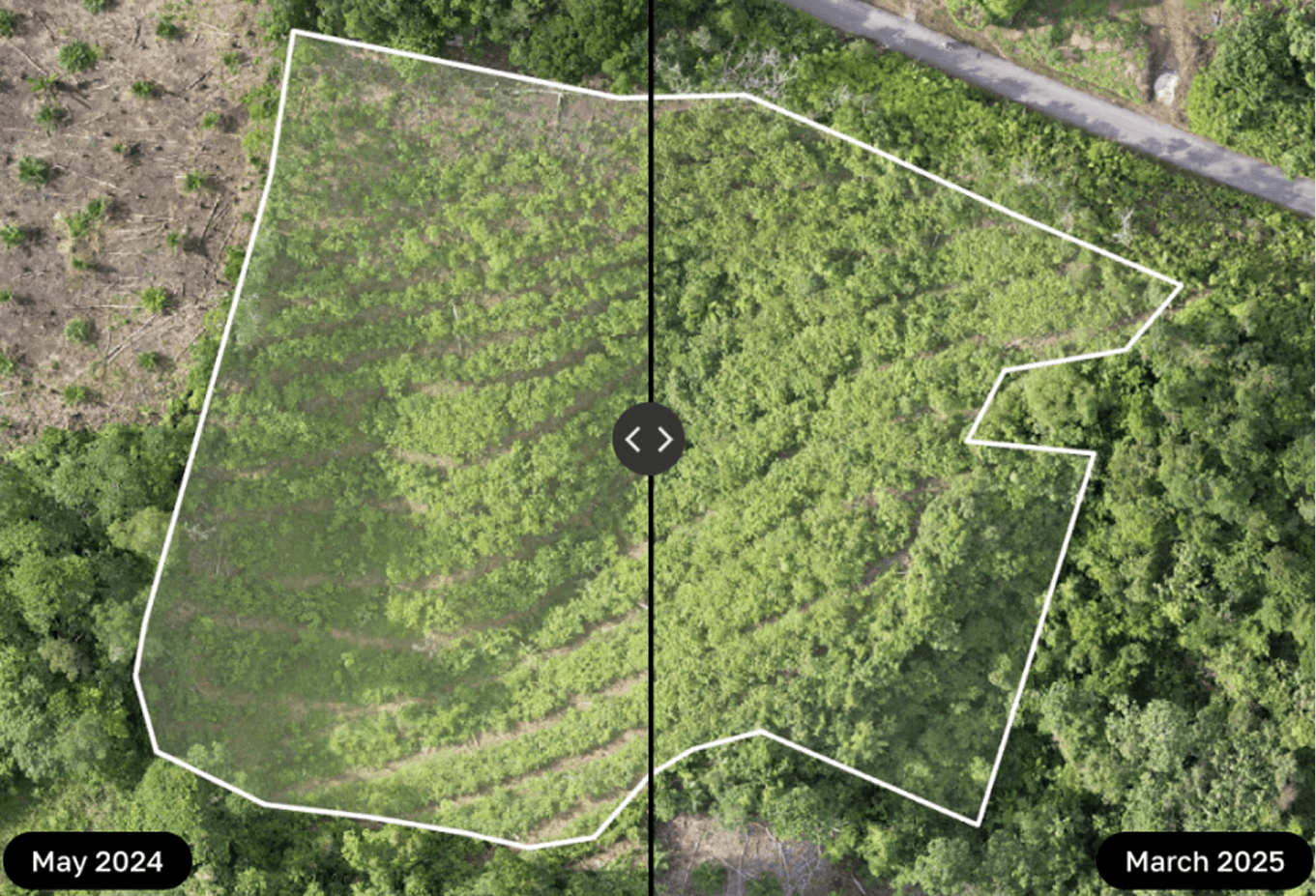 At the planting site in Desa Rumbih, West Kalimantan, FTI’s restoration was tracked and shown in a before–after format. Drone images from May 2024 and March 2025 document the transformation of a degraded hectare into a flourishing green landscape. Even after FTI stopped sponsoring the site directly, ALETRA continued the stewardship, cementing FTI’s legacy beyond a single campaign.